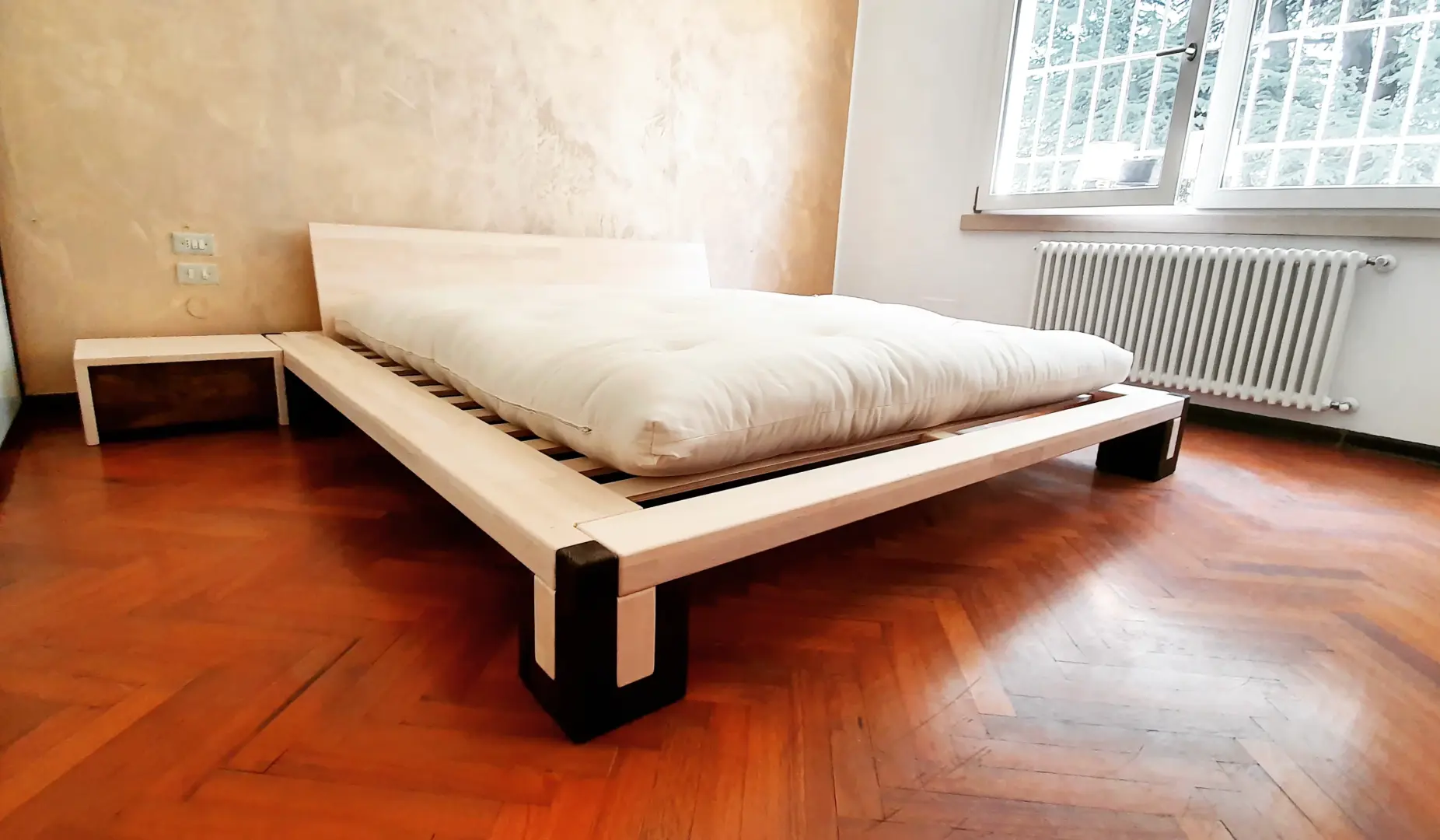 Lo Yuki bed è un letto di grande qualità, essenziale ed elegante completamente in legno, ad incastro senza parti metalliche, fatto a mano dal nostro falegname di fiducia.